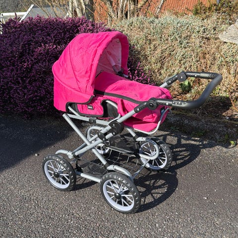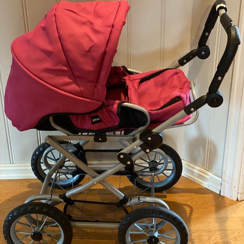 BRIO dukkevogn i lilla tekstil. Vognen har justerbart håndtak, justerbar liggedel og kalesje. Egen vognbag og regntrekk medfølger. Understellet er i metall med fire store hjul og varekurv under.