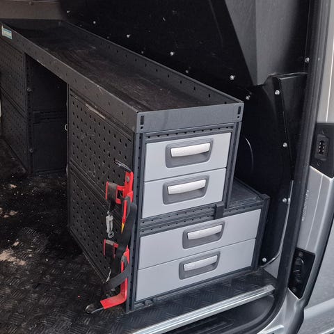 Innredningen består av et skuffesystem for montering i varebil, med flere skuffer i ulike høyder. Det er også montert en skrustikke på utsiden av innredningen, festet på en uttrekkbar. Under skuffeseksjonen er det et åpent rom for oppbevaring av større gjenstander eller kasser.