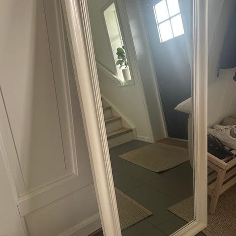 Hvitt speil med detaljer på rammen, pent brukt.