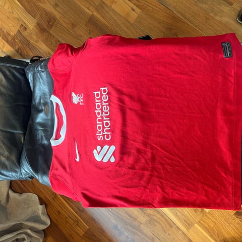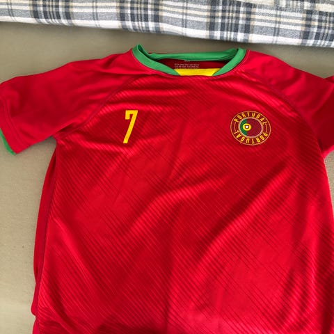 Danmark fotballdrakt i rødfarge med hvit trykk. Drakten har nummer 10 på ryggen og teksten «Danmark» i store bokstaver. På brystet er det et rundt emblem. Passer til bruk som supporterutstyr eller til fritid og trening. Materialet fremstår som typisk lett og pustende stoff for fotballdrakter.