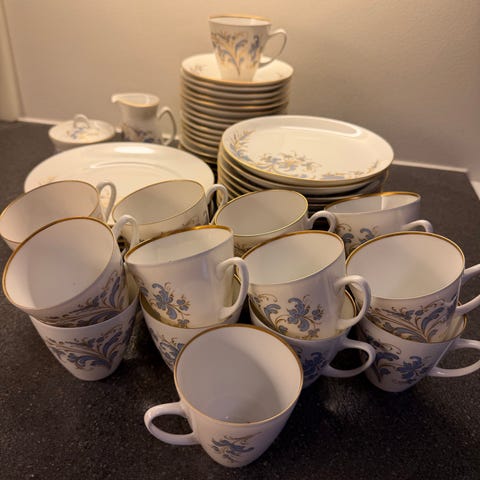 13 asjetter, 9 kopper og tallerkener, fløtemugge og sukkerskål.