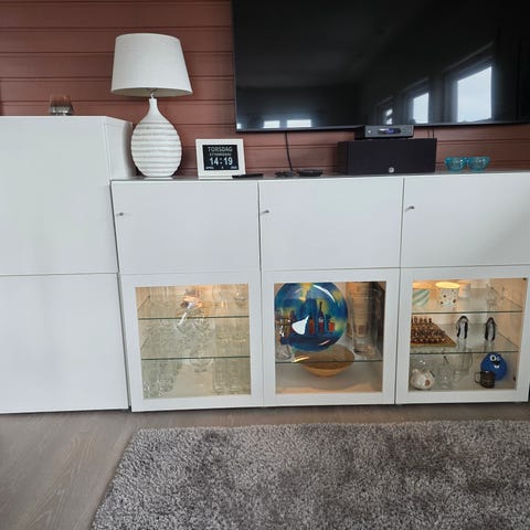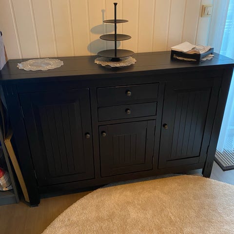 IKEA skjenk med to sideplasser med dører og tre skuffer i midten. Møbelet er i mørk/svart utførelse med enkle knotter på dører og skuffer. Skjenken gir god oppbevaringsplass til servise, tekstiler eller annet utstyr, og kan brukes i stue, spisestue eller gang. Toppflate har noen synlige merker/slitasje på kantene, som vist på bildene, Det er ikke hakk kun overflatemaling som er blitt borte men tror det fint kan flikkes opp. Selges kr 1000,- Sender ikke.