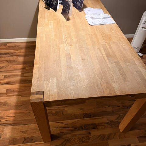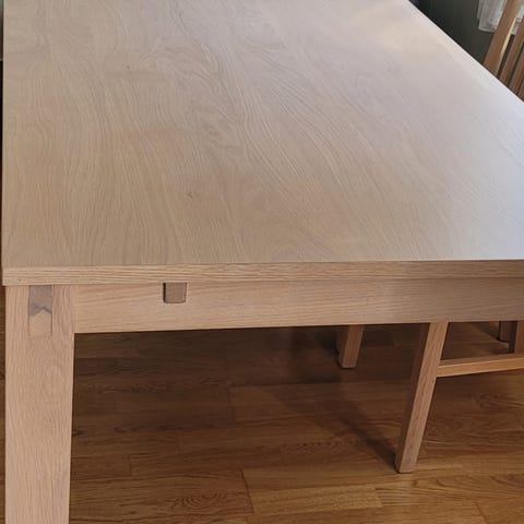 Det hører med to ekstra ileggesplater som kan monteres på hver ende av bordet for forlengelse. Naturlig heltre gir et nøytralt uttrykk som passer inn i de fleste oppholdsrom som spisestue eller kjøkken. Pent brukt, kan slipes og oljes for å få et ekstra lekkert «nytt» bord.