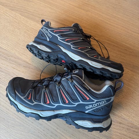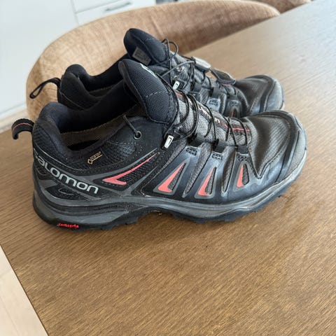 Salomon X Ultra GTX tursko i størrelse 38. Skoene er svarte med enkelte røde detaljer. Overdelen er i syntetisk materiale og tekstil med forsterkninger for økt slitestyrke. Modellen har Gore-Tex-membran (GTX) som gir vannavvisende og pustende egenskaper. Innleggssåle med OrthoLite for bedre komfort. Grovmønstret yttersåle gir godt grep på variert underlag, egnet for fotturer og annen bruk utendørs.
