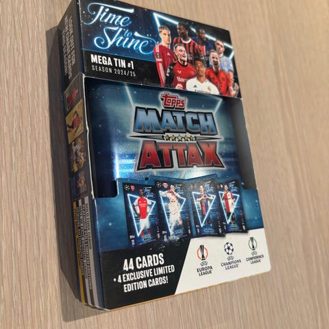 Fotballkort fra Topps Match Attax Mega Tin UEFA 24/25. Helt uåpnet.