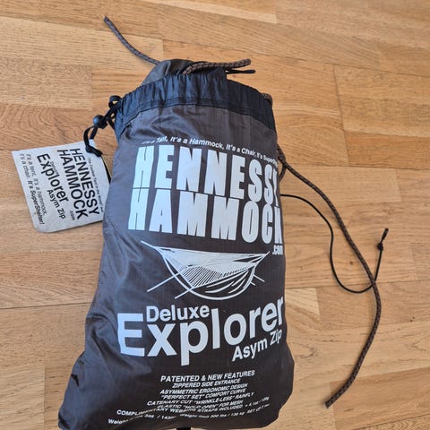 Hennessy Hammock hengekøye med integrert myggnett. Hengekøyen er beregnet for én person og er laget for bruk ute, for eksempel til tur, camping eller overnatting i skog og mark. Den henges opp med tau eller liner i trær eller andre solide fester. Myggnettet gir beskyttelse mot insekter under bruk. Egnet for bruk med liggeunderlag eller annet isolerende underlag etter behov.