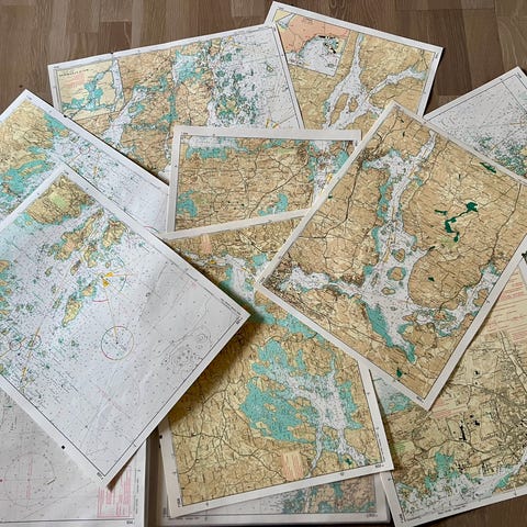 Sjøkart i papirformat som viser kystområde med øyer, sund og farleder. Kartet inneholder detaljer som dybdeangivelser, navigasjonsmerker og kompassroser. Egnet som dekorasjon på vegg i maritime miljøer. Størrelsen fremgår som et stort, sammenleggbart kart som kan rulles eller brettes for oppbevaring.