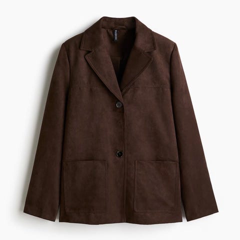 H&M blazer for dame i størrelse S. Blazeren er beige og laget i ullblanding, med glatt fôr på innsiden. Modellen har klassisk krage, to store frontlommer og en brystlomme, samt knappelukking foran og knapper nederst på ermene. Passer til både hverdagsbruk og mer formelle anledninger.