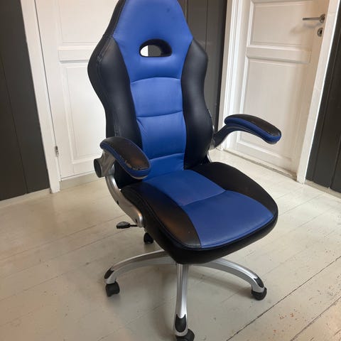 Kontorstol i gaming-stil med høy rygg. Stolen har blå stofftrekk i sitteflate og rygg, kombinert med svarte felter i kunstskinn langs sidene. Ryggstøtten har utsparinger øverst som gir et racingpreg. Stolen står på hjulunderstell og er egnet som skrivebordsstol til kontor, gaming eller hjemmearbeidsplass. Kunstskinnfeltene viser synlig slitasje flere steder, mens stoffdelen fremstår jevn i fargen.