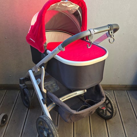 Ramme i metall med justerbar sitte/liggestilling. Liggedelen har madrass og trekk, og sittedelen har fempunktssele. Kalesjen er lys med nettingfelt for lufting og innsyn, nyere type "sommer"kalesje med innebygd myggnett. Følger også med regntrekk.