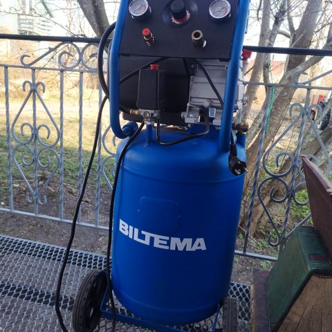 Biltema BT-L50 kompressor med liggende tank på 97 liter. Kompressoren er blå og montert på hjul med håndtak for enklere forflytning. Frontpanel med trykkmålere, regulator og tilkoblinger. Egnet som trykkluftkilde til ulike luftverktøy og oppgaver i garasje eller verksted, innenfor kompressorens kapasitetsområde og spesifikasjoner oppgitt på typeskiltet.