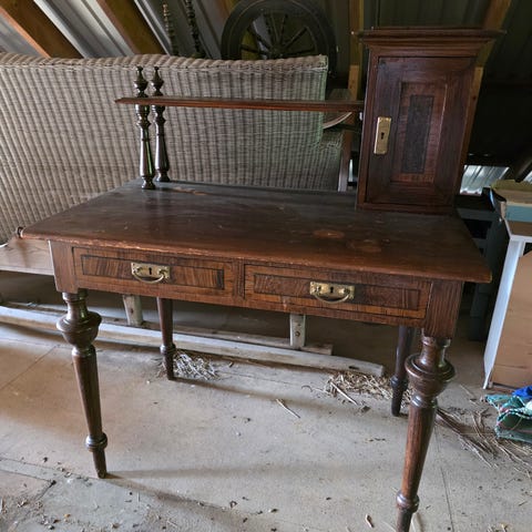 Sjarmerende vintage medisinskap i tre med dekorativ front og korsmotiv. Slike skap ble tradisjonelt brukt som førstehjelpsskap i hjem, skoler og verksteder.