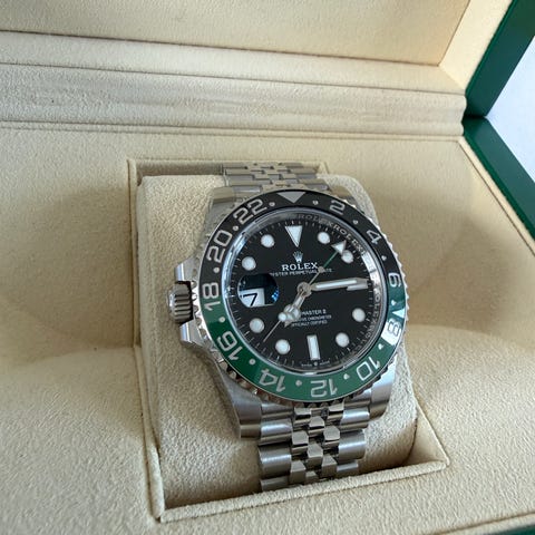 Rolex GMT-Master II Sprite herreklokke i stål med sort urskive og sort/grønn keramisk bezel. Modellen har jubilee-lenke i stål og roterende 24-timers bezel for visning av ekstra tidssone. Urskiven har datovisning kl. 3 og selvlysende timemarkører og visere for bedre lesbarhet i mørke.