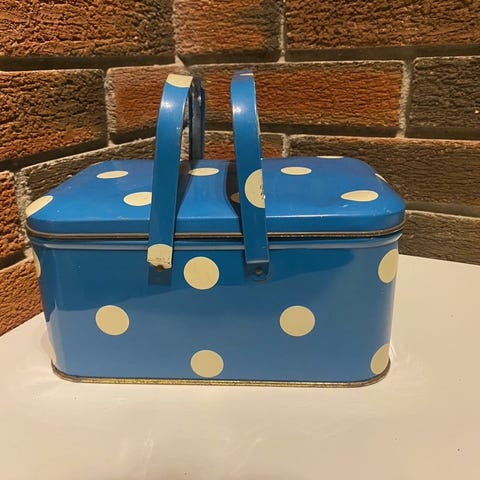 Selger en kjempesøt, vintage barnekoffert i papp med et klassisk hvitt og blått blomstermønster.