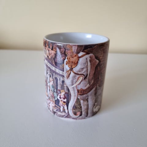 Store krus i keramikk/steingods i hvit farge med svart, detaljert motiv rundt hele koppen. Kruset har hank og passer til servering av varm og kald drikke som kaffe, te eller kakao. Designet viser et klassisk, illustrert motiv i sort-hvitt-stil av slangen som spiser menneske. Likt det i Vigelandsparken og alfa Romeo logoen