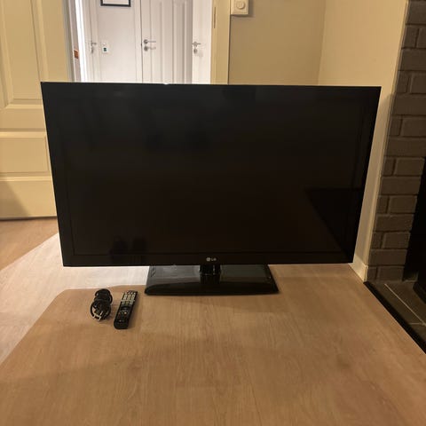 Samsung TV med bordstativ. Skjermen har blank svart ramme og rund fot. Egnet som TV eller ekstern skjerm til for eksempel dekoder, PC eller spillkonsoll, avhengig av tilkoblingsmuligheter på baksiden. Nøyaktig modell, størrelse og oppløsning er ikke oppgitt og bør kontrolleres ved behov.