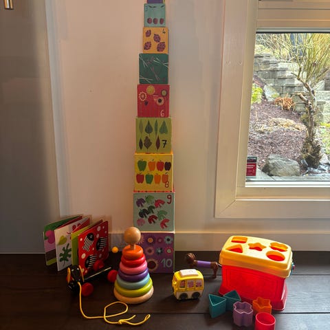 2 puslespill i tre (kr 10,- pr stk), boks med «stablehus» og plastdyr (40,-), memoryspill (10,-) og teppe formet som hund( gratis)