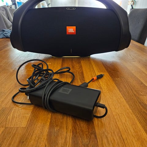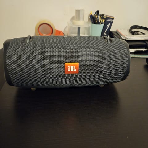 JBL Xtreme bærbar Bluetooth-høyttaler i svart. Høyttaleren har bærestropp og leveres med strømadapter/lader. OBS: denne fungerer ikke som den skal. Den kan lade i lang tid, også spiller den bare i noen minutter før den skrur seg av. Med laderen i så har den noen dager fungert litt, også skrudd seg av. Har ikke peiling på om dette er en easy-fix å skifte batteri eller annen lader, eller om den er søppel. Legger den ut her for å sjekke om det er noe respons og om noen andre kan fikse den og ha nytte av den - som har kunnskapen til det :)
