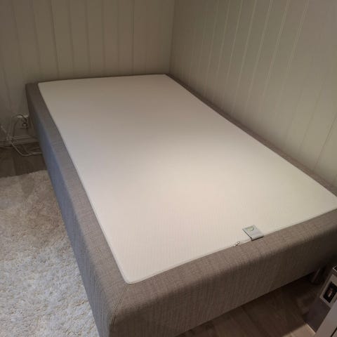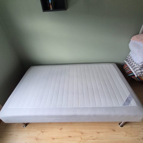 IKEA Slåstad rammemadrass i grått trekk. Madrassen står på metallben. Selges uten overmadrass. Må hentes