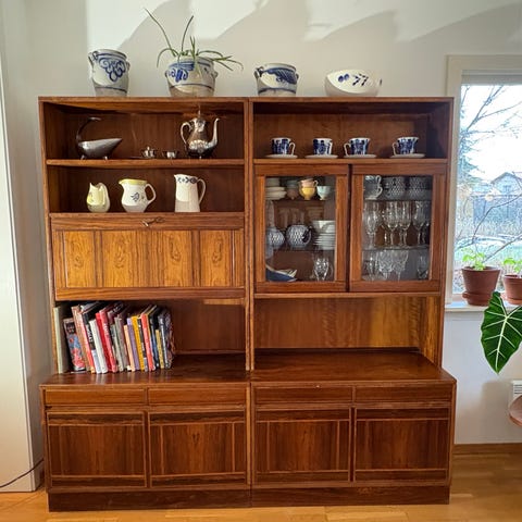 Vitrineskap i tre med flere seksjoner. Øvre del har glassdører med hyller for oppbevaring og utstilling av servise, glass eller pyntegjenstander. Nedre del har skap med tette dører og skuffer som gir ekstra lagringsplass. Passer til stue, spisestue eller kjøkken for organisert oppbevaring og oversiktlig visning av innhold.
