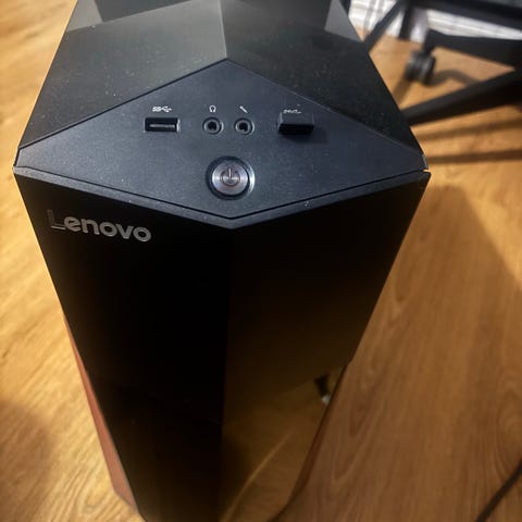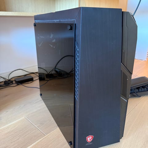 Selger en stasjonær PC som har vært brukt til gaming. Maskinen fungerer godt. Det hender at en av ledningene som har løsna litt kommer borti vifta, man kan enten åpne den og fikse problemet eller løfte den fra siden så ledningen havner bak. Kun irriterende lyd som er problemet.
