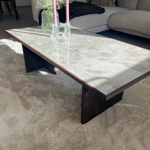 Selger et pent brukt sofabord i mangotre med bordplate i marmor fra Ellos, modell Nilla.