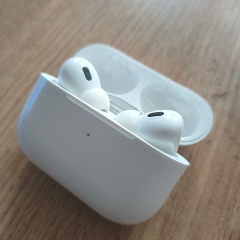 Apple AirPods trådløst headset i hvit farge. Headsettet leveres med ladeetui som beskytter øreproppene når de ikke er i bruk og gir ekstra batteritid. AirPods kobles trådløst til kompatible Apple-enheter og andre enheter som støtter Bluetooth. Egner seg til lytting av musikk, podkaster, video og tale, samt bruk til telefonsamtaler og videomøter.