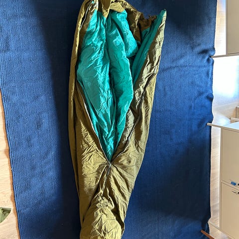 Soveposen veier kun 1,1kg, og holder deg varm selv når temperaturen faller godt under null. Har vært oppbevart i innendørs bod i nettingpose, og er i tipp topp stand. Vanntett kompresjonspose følger med.