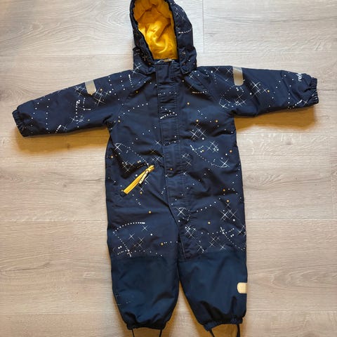 Selger en brukt vinterdress fra Reflex i størrelse 86. Den er godt brukt men mye bruk igjen. Ingen hull men litt slitt ved sømm foran, se bilde. Begge fotstrikkene er like hele.