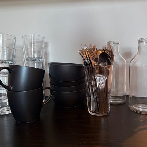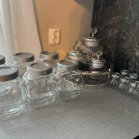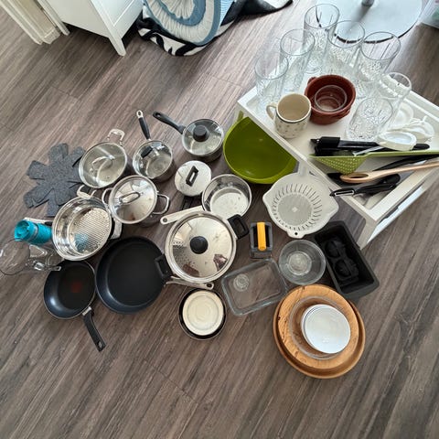 Ulike merker, Forskjellige kjøkkenutstyr : svarte krus, plastglass, tre vann karaffel, vannflasker i glass, vase med pynt , liten vase, putetrekk , to kurver, to termos, vannflaske noen håndkle.