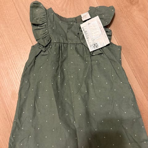 "Et sett med topp i ribbestrikket bomullstrikot og selekjole i bomullstwill. Langermet topp med rund hals, nøkkelhullåpning bak med knapp i nakken og overlocksydde kanter nederst og på ermene. A-lineskåret selekjole med regulerbare seler med trykk-knapper og en utenpålomme på brystet."