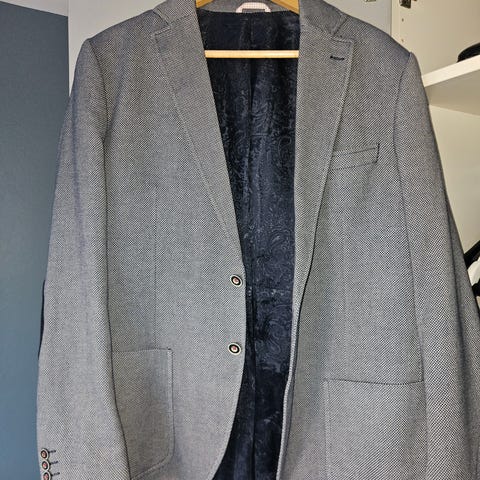 Pen blazer i melert grå fra Boss. Lite brukt og i meget god stand. Selges kr 1200frakt kommer i tillegg.