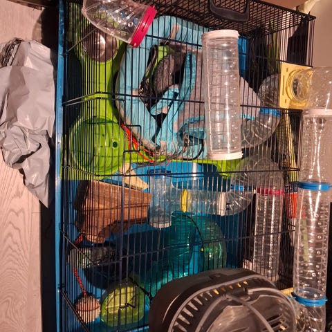 Hamsterbur egnet for smågnagere som hamster eller mus. Buret har plasttopp med god sikt inn, metallgitter nederst og bunn i plast. På utsiden er det festet gjennomsiktige løperør/tunneler. Inne i buret følger det med et lite hus, matskål og drikkeflaske. Passer til innendørs bruk.