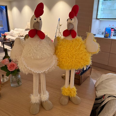 Påskepynt. Gul høne og hvit høne med forkle, høyde 75 cm. Pent brukt.