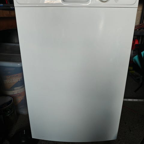 Vaskemaskinen er godt brukt, og den er noe skeiv ved beina.