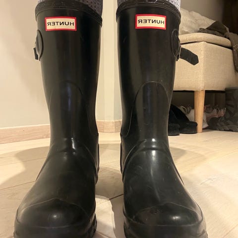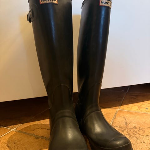 Hunter regnstøvler i størrelse 39 som er veldig lite brukt. Høye, svarte gummistøvler med justerbar spenne øverst på skaftet. Klassisk modell i vanntett materiale som egner seg til bruk i regnvær og vått underlag.