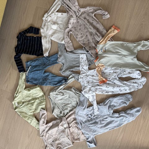 En ullbody og en ullbukse. Resten er bomull. Strømpebuksene er str 50-56.