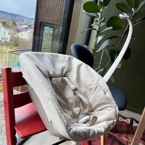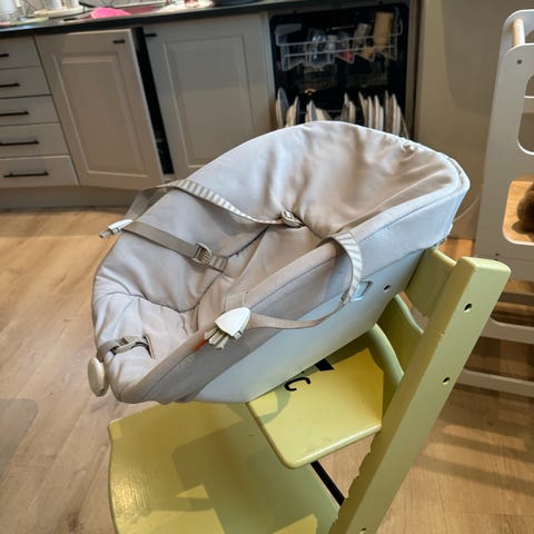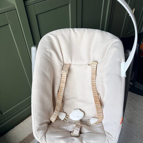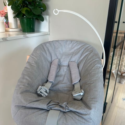 Pent brukt newborn seat. Trekket kan tas av og vaskes. Monteres enkelt på stokke tripptrapp-stol med et klikk. Arm til uro/leke medfølger. Denne kan også tas av og på. Noen riper på denne, men er kun estetisk og har ikke noe å si for funksjon. Alt fungerer som det skal.