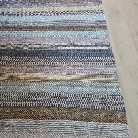 Rugvista teppe med geometrisk mønster i flere farger. Teppeflaten har kombinasjon av sikksakk- og sirkelmønster i lyse og mørke nyanser, blant annet beige, grå og rødlige toner. Passer som gulvteppe i stue eller andre oppholdsrom. Opprinnelig pris: 4079,-
