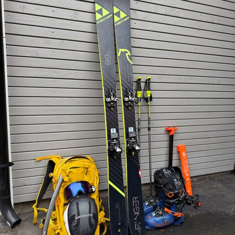 K2 topptursett med ski, toppturstøvler og teleskopstaver.