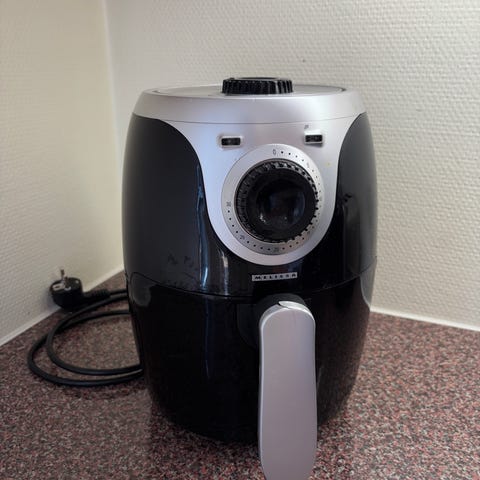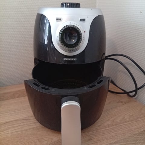 Brukt Airfryer, kjøpt på Europris for noen år siden. Knapp til timer er litt løs, men fungerer godt.