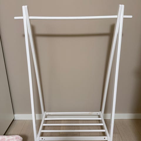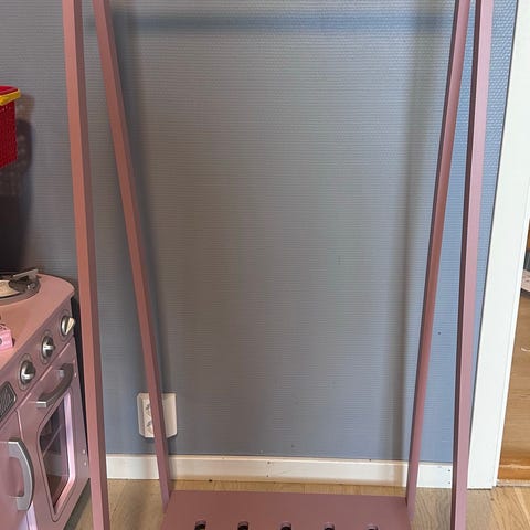 Jollyrooms klesstativ for barn i en dus gråfarge. Stativet har enkel stang til oppheng av barneklær og en åpen bunnhylle med utskåret skyemotiv i front. Passer til barnerom for organisering og oppbevaring av klær, kostymer eller tilbehør i barnehøyde.