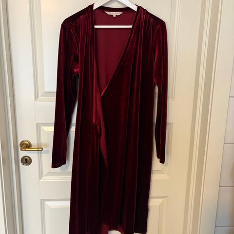 Nelly festkjole for dame i størrelse M. Kjolen er laget i polyester med velurlignende overflate og kommer i en dyp rød farge. Modellen har lange ermer, markert midje og utsvingt skjørt. Utringning foran med V-hals. Passer til bruk ved fest og andre anledninger der en enkel, rød kjole ønskes.
