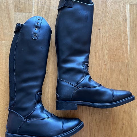 Cavallo ridestøvler i svart skinn. Høye støvler med glidelås bak og snøring foran ved ankelen. Gummisåle med mønster for grep. Passer til ridning og stallbruk.