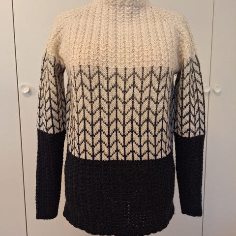 Genseren er strikket av selger i røyk- og dyrefritt hjem, med over et halvt århundres strikkeerfaring.