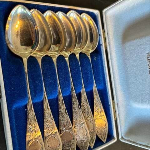 To gamle sølv skjeer - 11 cm lange, den ene stemplet: 830S og Nils Hansens sølvvare og den andre stempel: 830S og en N. Jeg er ingen ekspert på gammelt sølv, men vil jo tro at det er samme produsent. Selges samlet. Kan hentes på Nesbru, eller jeg sender til deg.