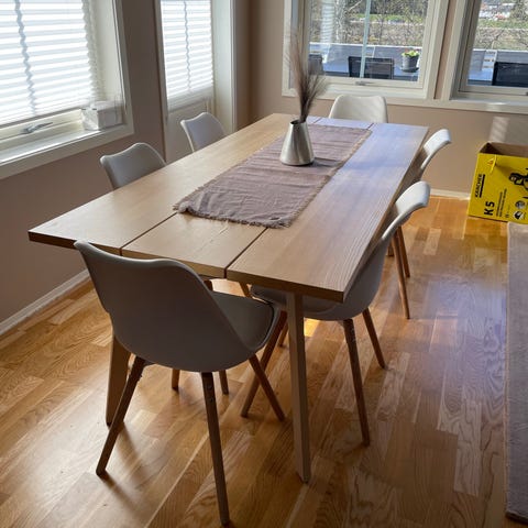 Ileggsplatene gjør at bordet kan gjøres endel lengre. Ileggsplatene har annen overflate enn selve bordplata, men dette kan skjules med en duk. Bordet er i god stand, men har normal bruksslitasje, og bordbena er ganske slitt nederst, som man kan se på bildene. Beina er avtagbare, så det kan gjøres flatt til transport.