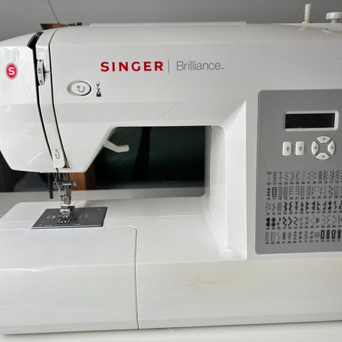 Det følger med instruksjonsbok på skandinaviske språk og diverse tilbehør, blant annet ekstra fot/guide som vist på bildene. Maskinen har bærehåndtak på toppen og trådstativ for flere sneller bak på maskinen.