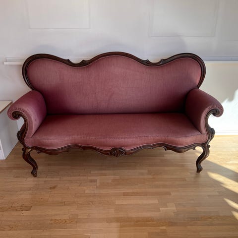 Nydelig vintage sofa i heltre med rødt fløyelstrekk.