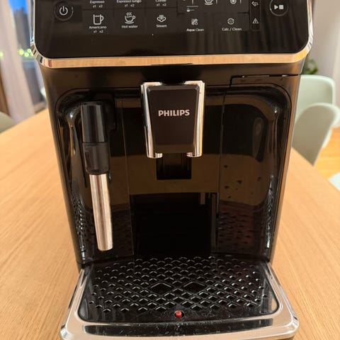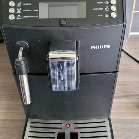 Philips helautomatisk espressomaskin i svart utførelse. Kaffe maskinen fungerer helt fint. Den er jevnlig rengjort og har normale bruksspor. Lager både espresso og vanlig kaffe, og har steam pipe for melkeskum. (Pipen mangler)